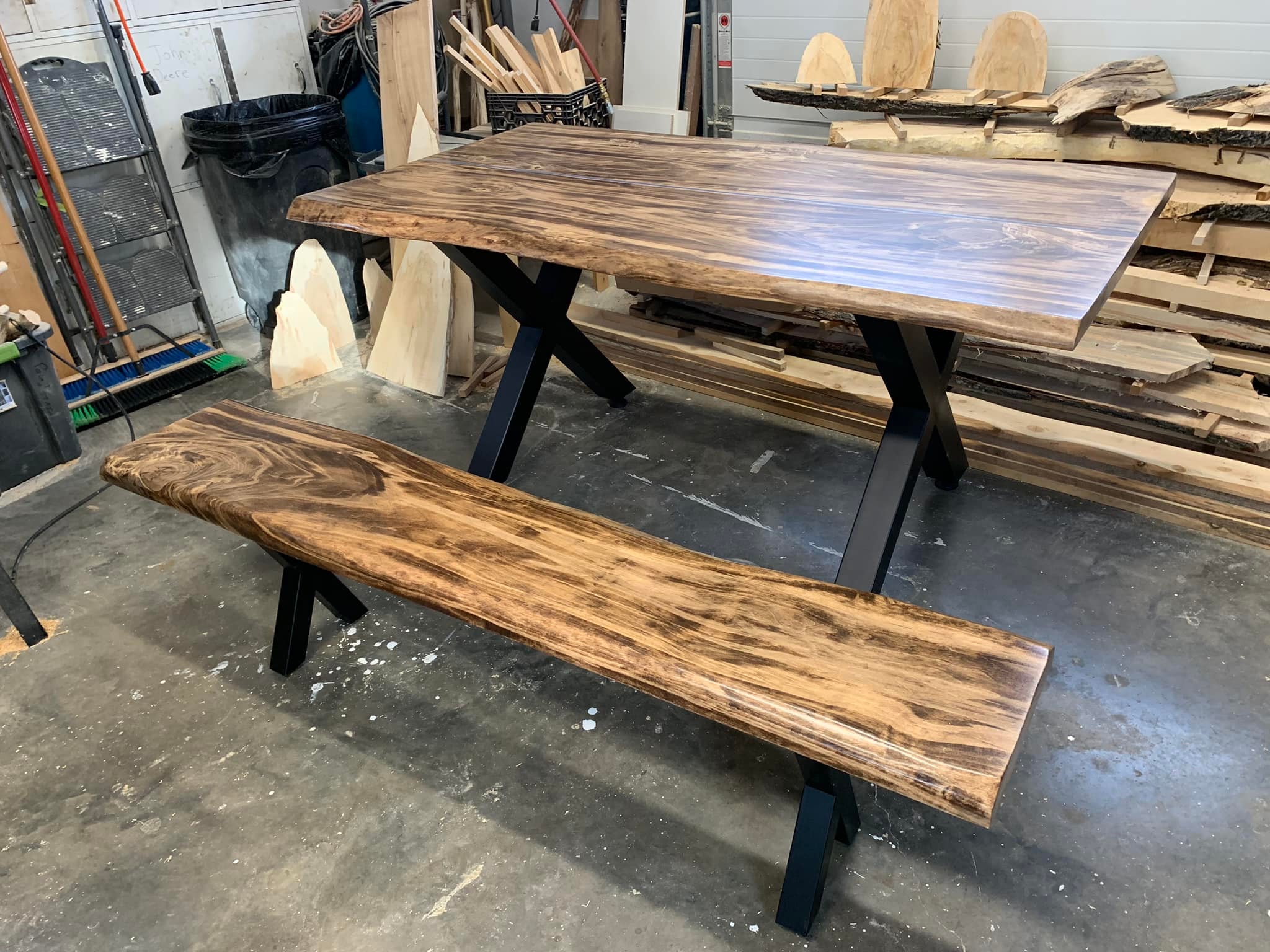 A lot of sawyers pine for the chance to get their hands on walnut and cut it into slabs for their project. Bill's done just that, and run dowels through it to attach the legs. The color of the walnut really pops against the material of the legs, giving it quite an eye catching look.
