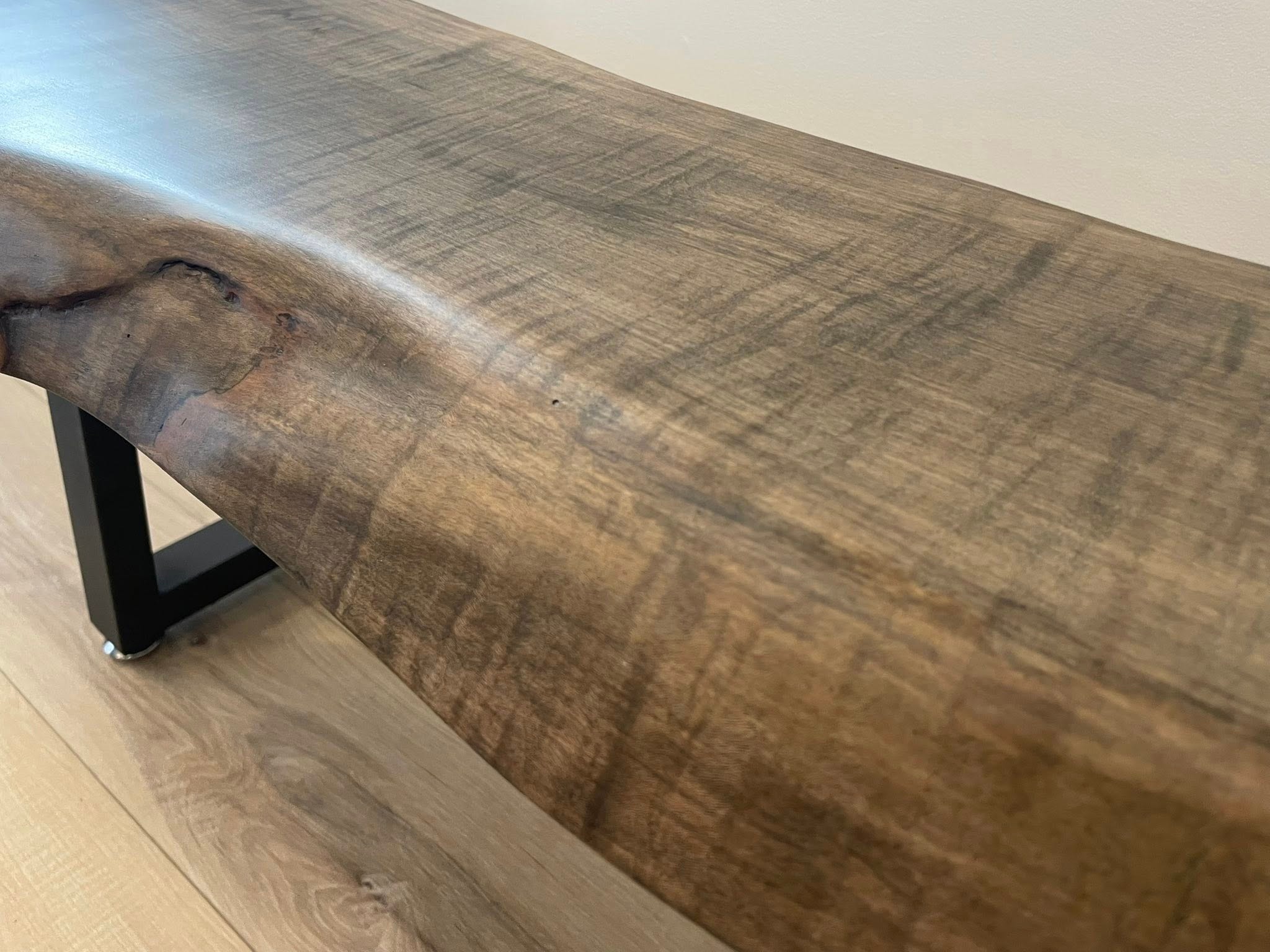 You can never do too much sanding, as Johnny demonstrates with his smooth live-edge slab bench. The natural shape of the slab is still there, but with a fine finishing process that makes it easy to sit on, with fashionable metal furniture too.