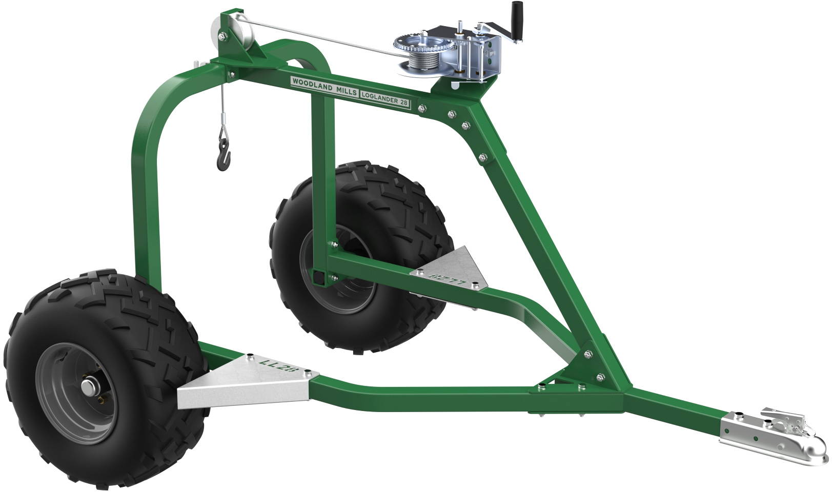The Loglander™ comes equipped with a 2500 lb (1134 kg) capacity 2-speed manual winch. The winch has a braided stainless cable that runs through a durable sealed roller bearing pulley. Also included is a 5/16” 8-foot choker chain.